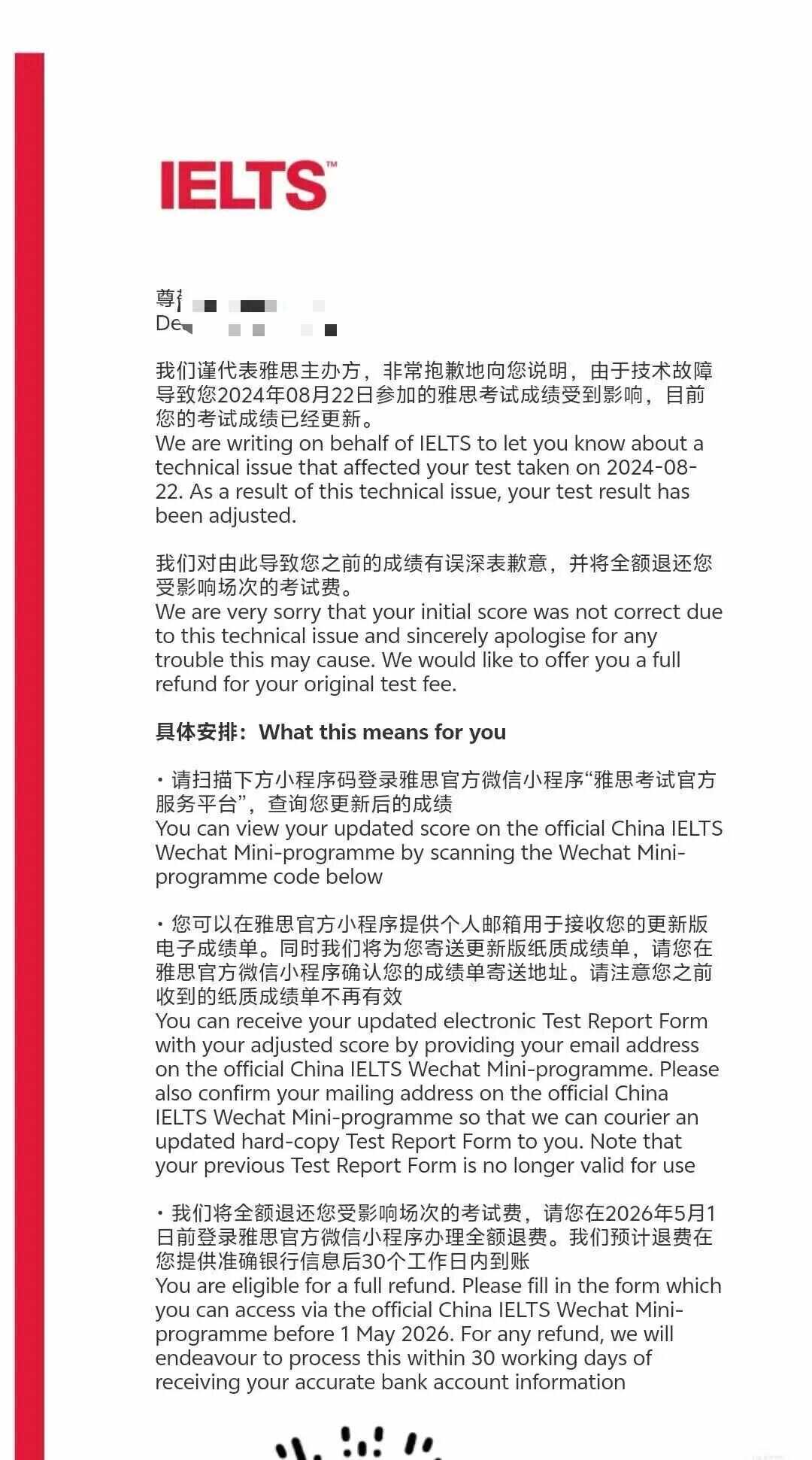 近日,雅思考试主办方向部分考生发送邮件称,由于技术故障,考生参加的某项雅思考试成绩受到影响。测试成绩已更新。同时,他们对由此产生的错误分数表示歉意,并将全额退还受影响场次的考试费用。 11月18日,雅思考试主办方英国文化协会确认,该故障影响了2023年8月至2025年9月的“少数考生”,系统已修复,审核及退款机制已全面启动。在社交平台上,网友们对此褒贬不一。郑州一名考生在社交平台上表示,自己在2024年的不同时间参加了两次雅思考试。11月12日,在收到官方退款邮件和两条雅思短信后,他登录官方平台核实详情,发现自己参加的两次考试均符合退款条件,这意味着他将获得两次考试费用的全额退款。 “这是一笔意外之财,”他描述道。据雅思考试主办方英国文化协会公开数据显示,2023年全球雅思考试人数将超过400万人,创历史新高。此事件会影响候选人库 25 个月。官员表示,超过99%的考生成绩未受影响,预计受影响人数不到8万人。目前,雅思官方已承诺向所有受到该分数影响的考生提供全额退款。据了解,雅思考试单次费用,以中国大陆为例,2025年雅思普通考试费用为2170元。雅思考试还明确了具体的善后流程:考生需要通过雅思官方微信小程序查看并更新成绩,并确认邮寄地址,以获得新版的纸质成绩报告。退款必须通过小程序处理2026年5月1日前,预计30个工作日内到达账户。来源 |九派新闻、南方都市报